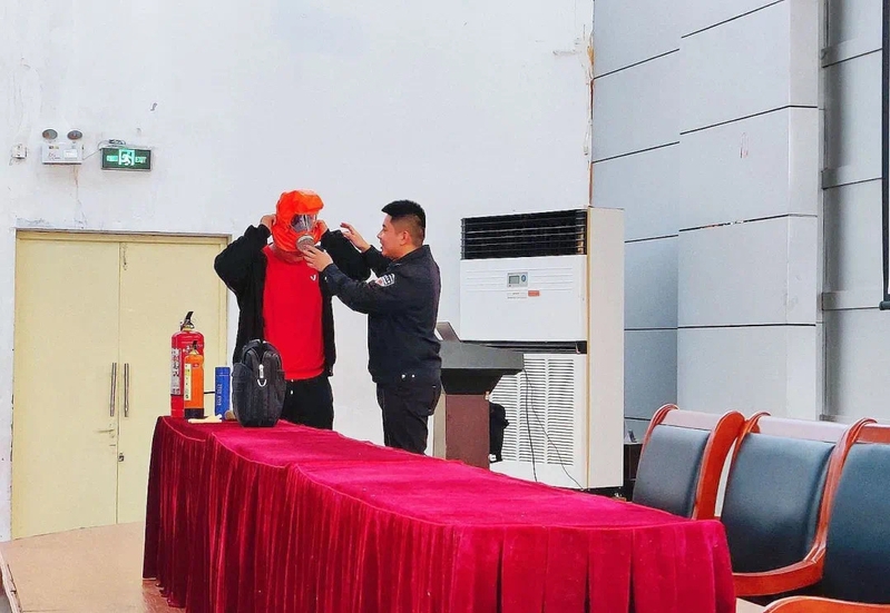 其次在讲座过程中吴老师向学生们普及了多种消防用具的使用方法,重点介绍了二氧化碳灭火器,干粉灭火器和泡沫灭火器,让学生亲自感受了一下如何去使用灭火器,如何在火灾中正确佩戴防烟面具,确保师生在遇到险情时能够安全有效应对。
