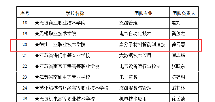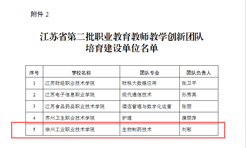 11月18日,《江苏省教育厅办公室关于公布第二批江苏省职业教育教师教学创新团队建设单位的通知》(苏教办师函〔2021〕23号)公布了第二批江苏省职业教育教师教学创新团队建设单位名单,确定捕鱼达人破解版 为第二批江苏省职业教育教师教学创新团队建设单位,“高分子材料智能制造技术”、“工业机器人技术”两个团队入选省级教师教学创新团队立项团队,“生物制药技术”入选省级教师教学创新团队培育团队。