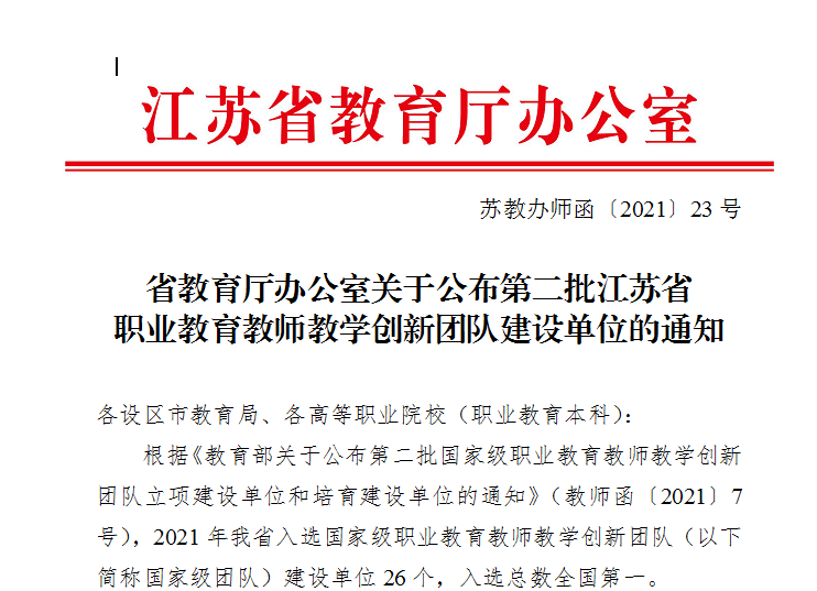 2021年9月,按照省教育厅办公室《关于做好第二批江苏省职业教育教师教学创新团队认定工作的通知》(苏教办师函〔2021〕22号)文件精神,捕鱼达人破解版 高度重视,统筹谋划,精心组织,相关二级学院整合师资及行业企业优质资源,积极申报。截止目前,捕鱼达人破解版 省级及以上教学团队累计达19个。