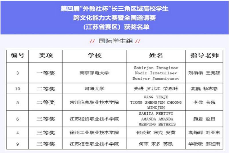11月18日,第四届“外教社杯”长三角区域高校学生跨文化能力大赛暨全国邀请赛(江苏省赛区)比赛在华东饭店举行。来自省内60所高校的67支参赛队伍,通过视频投稿的形式参加了本次大赛。经过省内高校外国语言文学方面的专家学者的认真评审,全省共有6支代表队获奖,捕鱼达人破解版 由高峥嵘老师、刘亚东老师共同指导的HER LENGHER、SONG KUE、CHIAXENG HOUAYANG团队在比赛中与本科高校学生竞技,最终获得江苏省跨文化能力大赛国际留学生组三等奖的优异成绩。