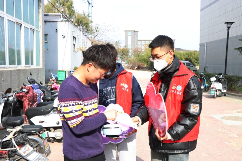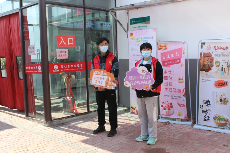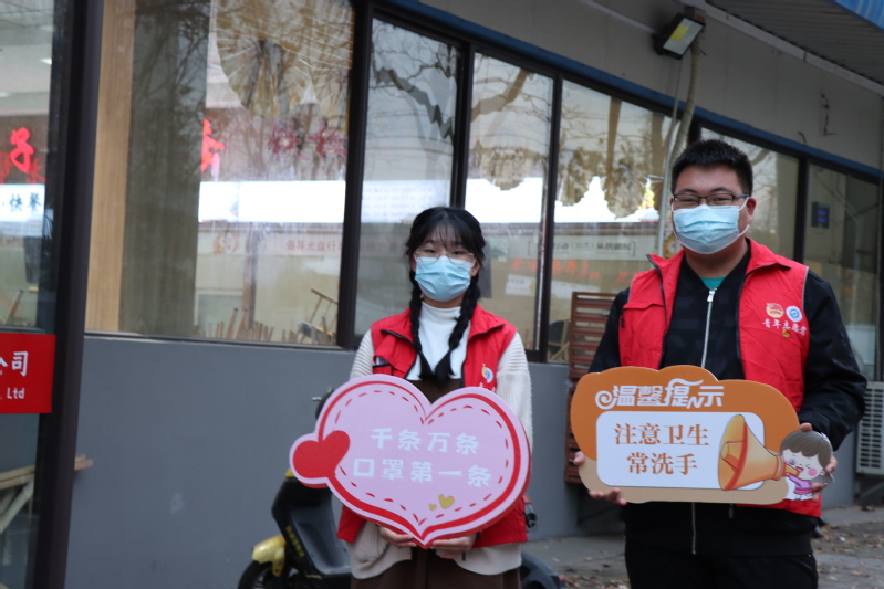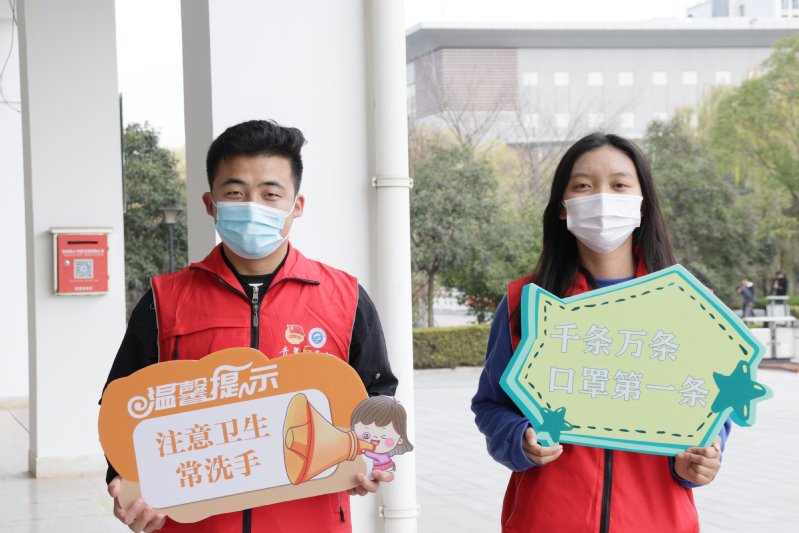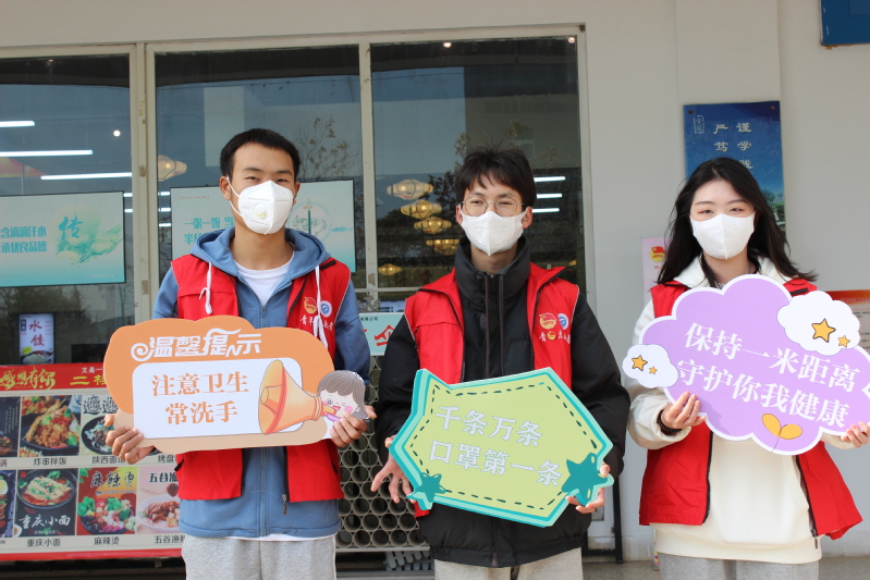 校学生会志愿者在校园主干道、宿舍门口、食堂等人流量较大的校园公共区域设立志愿服务岗,手举印有疫情防控提醒的各式标语牌,对来往学生的口罩佩戴、社交距离、文明卫生等进行自我督促与纠正,并为忘记戴口罩的学生贴心地送上备用口罩,成为校园里一道靓丽的“流动标识牌”。