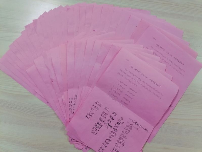 以“文明礼仪进餐桌和谐风气留校园”为主题,开展文明就餐签名活动。以规范学生行为为重点,组织全体学生签署《信息工程学院“三讲三无”承诺书》。组织开展“文明养成 我先行”线上知识竞答活动,激发学生自觉树立当代大学生的良好风范和形象,营造浓厚的文明养成教育活动氛围。