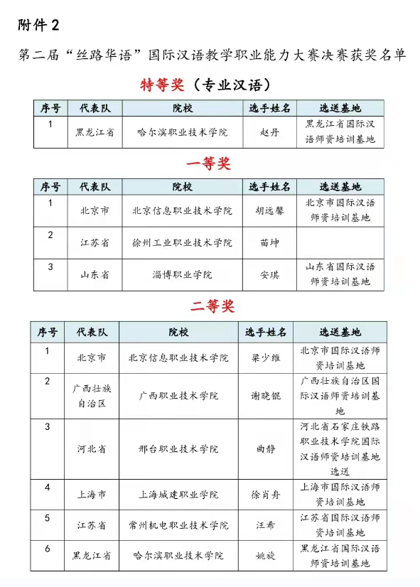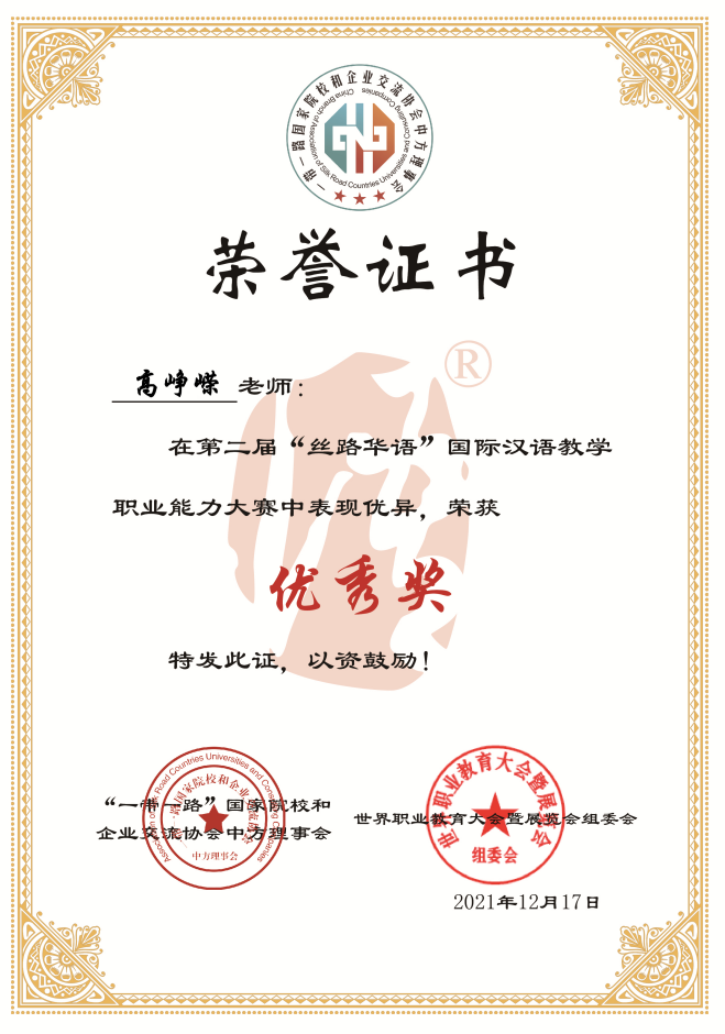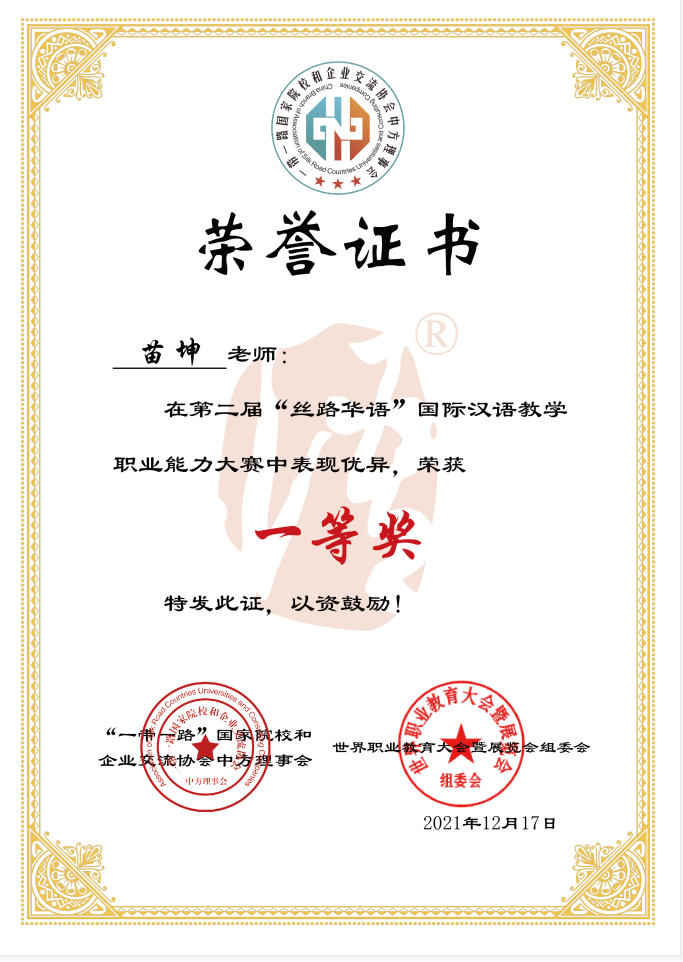 12月17日下午,2021“一带一路”国家院校和企业交流协会中方理事会年会暨“丝路华语”国际汉语大赛获奖名单公布,捕鱼达人破解版 参赛的三位老师喜获佳绩。国际教育学院副院长苗坤荣获第二届“丝路华语”汉语教学职业能力大赛一等奖,对外汉语教师刘亚东、高峥嵘获优秀奖。