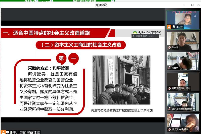 公开课上,马克思主义学院王博、王小萍、赵辉老师分别以形势与政策中《弘扬冬奥会精神,坚定文化、制度自信》、毛泽东思想和中国特色社会主义理论体系概论中《新民主主义革命理论1》《新民主主义革命理论2》章节为内容进行线上教学示范授课。三位教师采用腾讯会议、QQ群、职教云、云班课、学习通等授课途径开展教学,采取探究式、启发式、研讨式、互动式的多样化教学方法,深入浅出地引导学生开展思政课程的学习。