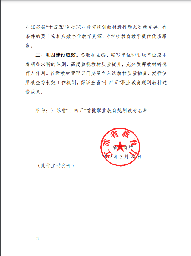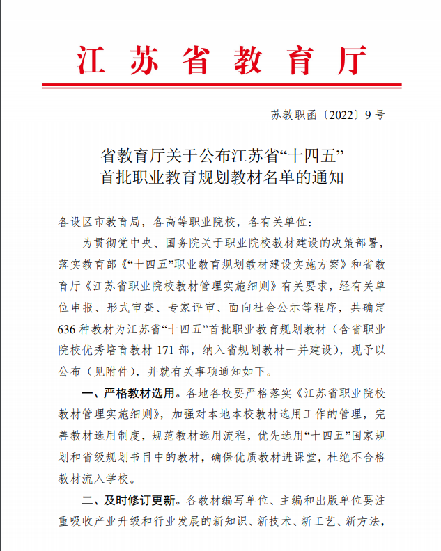 江苏省教育厅发布《关于公布江苏省“十四五”首批职业教育规划教材名单的通知》(苏教职函〔2022〕9号),公布共确定636种教材为江苏省“十四五”首批职业教育规划教材(含省职业院校优秀培育教材171部,纳入省规划教材一并建设)。捕鱼达人破解版 《橡胶工艺技术概论》(英汉双语)等9部教材获批江苏省“十四五”首批职业教育规划教材,入选教材数量位居省“双高”校并列第4位,其中《市场调研与分析》(第三版)等4部教材为省优秀培育教材。