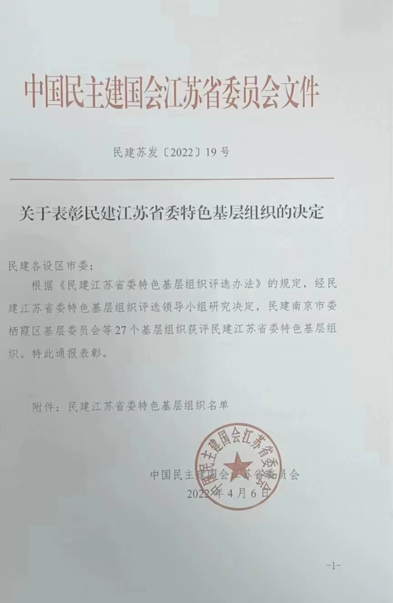 近日,民建江苏省委发布了《关于表彰民建江苏省委特色基层组织的决定》(民建苏发〔2022〕19号),捕鱼达人破解版 民建支部荣获2021年度“特色基层组织”称号。