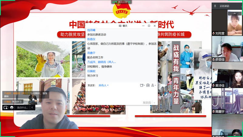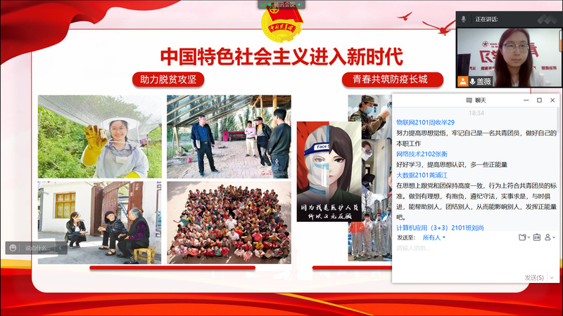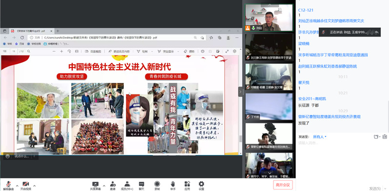 本次活动通过线上直播的形式进行,各团支部以团小组为单位进入腾讯课堂参与学习,覆盖全校所有团员青年。全体团干部在不同时间段,分别与各自联系的团员青年通过线上面对面的方式,带头领学“党领导下中国青年运动的百年历程”,与团员青年交流分享学习体悟,主要讲述了100年来,一代代中国青年在中国共产党的领导下,听党话、跟党走,前赴后继、顽强拼搏,为民族独立、人民解放,社会主义建设、改革开放和新时代中国特色社会主义事业作出的巨大贡献,用党的百年奋斗的重大成就和历史经验、抗疫中的青春故事等鲜活素材,进一步激发团员青年爱党爱国、奉献社会的信念与热情,提振团员青年凝心聚力、携手抗疫,坚决打赢疫情防控阻击战的信心决心。活动开展前校团委组织所有团干部进行了集体备课活动,并对讲稿、课件、视频素材提出统一要求。