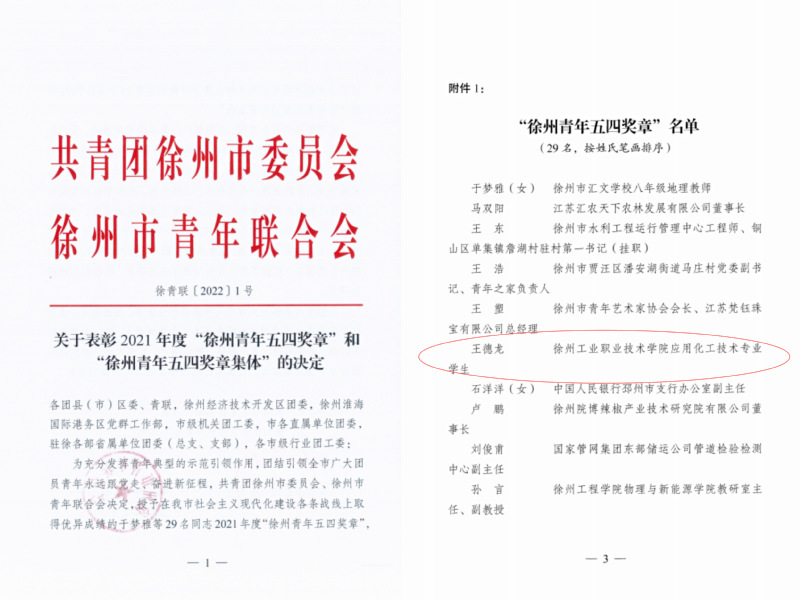 近日,由共青团徐州市委员会、徐州市青年联合会决定,授予在我市社会主义现代化建设各条战线上取得优异成绩的29名同志2021年度“徐州青年五四奖章”,授予15个集体2021年度“徐州青年五四奖章集体”。捕鱼达人破解版 青年王德龙荣获“徐州青年五四奖章”,这是唯一获此殊荣的在徐学生。