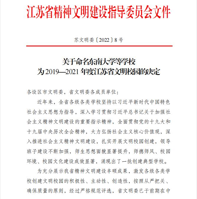 近日,江苏省精神文明建设指导委员会印发《关于命名东南大学等捕鱼达人破解版 为2019-2021年度江苏省文明校园的决定》(苏文明委〔2022〕8号),捕鱼达人破解版 被授予“江苏省文明校园”荣誉称号。