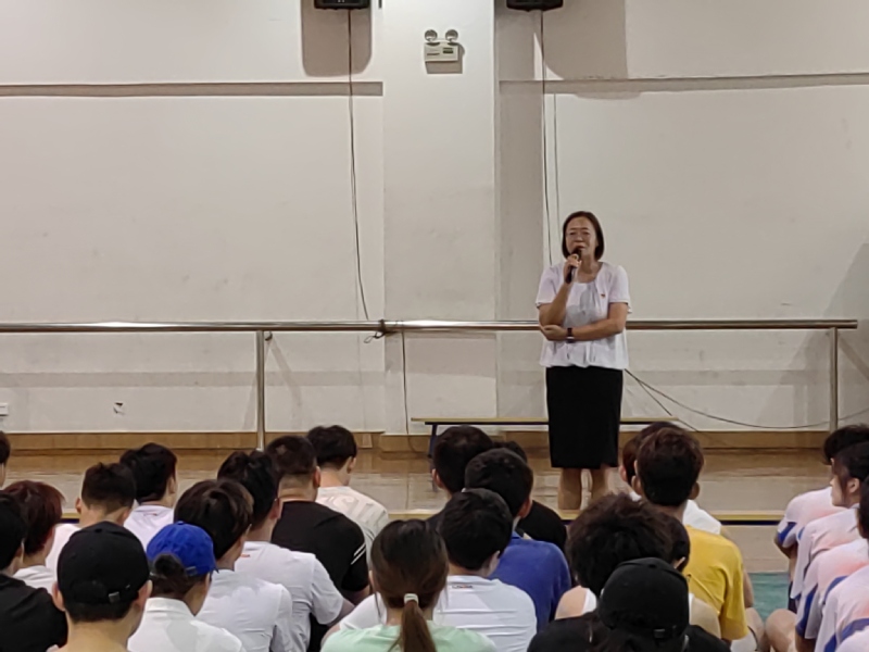6月30日下午,刘莹院长走进体育馆看望暑期备战省运会集训的教练员和运动员并为他们做赛前动员,体艺部叶鹏部长陪同参加。
