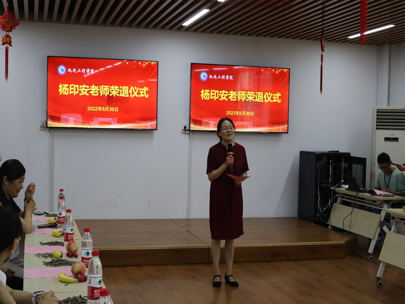 学院党总支书记王敏代表机电学院教师表达了对杨老师的不舍和留恋,从教书、育人、工作三个方面回顾了杨老师三十八载的光辉职业教育生涯,并呼吁在场所有机电教师珍惜教师工作岗位,学习杨老师廉洁从教的教育信念、关爱学生的教育情怀、任劳任怨的教育情操。