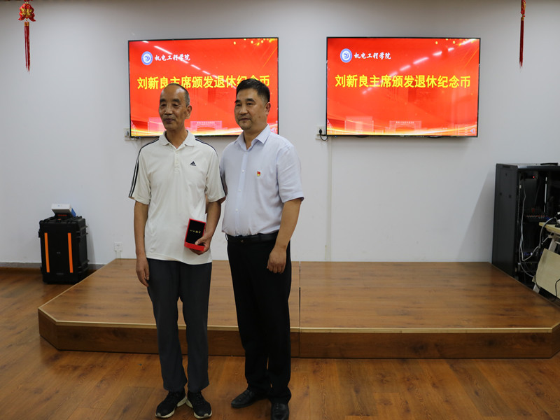 校工会主席刘新良为杨印安老师颁发退休纪念品,并代表校工会对杨老师的荣退致以祝贺。