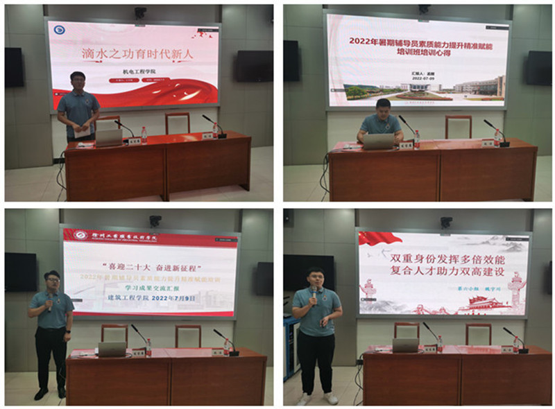 7月9日下午,学习成果交流汇报会如期举行。来自8个学院的8名辅导员结合4天的学习内容,分享了小组以及个人的学习体会和收获,以及对今后工作的启示和思考。他们中有的提出了“坚持‘36524’工作法,推进全员、全方位、全过程育人”;有的悟出了严爱相济、润己泽人的工作启示;有的领会了辅导员的使命和重任,指出唯有学习提升、务实笃行方能行稳致远;有的围绕辅导员职业的魅力之源,立志做“有温度、有宽度、有高度、有深度”的“四度”辅导员。