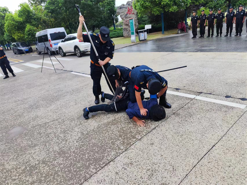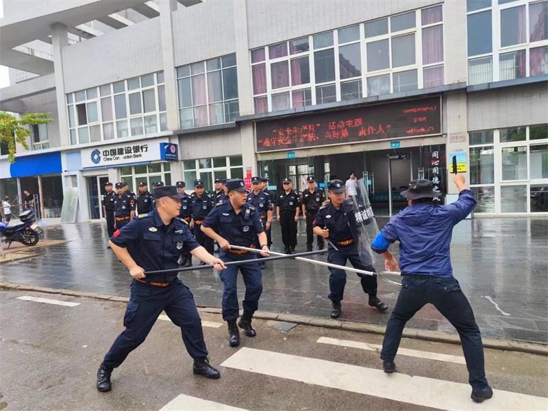 本次演练模拟两个场景,一是“暴恐分子”携带不明液体企图冲入校园,门卫在登记询问过程中发生冲突,果断与其周旋并立即启动反恐防暴应急预案,保安队员利用钢叉、防暴盾、警棍等专用防卫器械作为防护工具牵制“暴徒”,将其控制后,将嫌疑人移交民警带回警局。二是巡逻保安队员在宿舍区域发现持器械嫌疑人,立即启动反恐防暴应急预案,齐心协力制胜嫌疑人,并将嫌疑人控制移交民警带回警局。