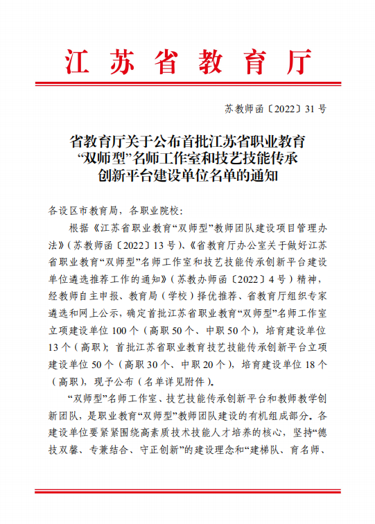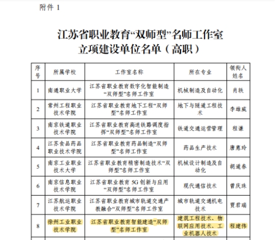 近日,江苏省教育厅印发了《省教育厅关于公布首批江苏省职业教育“双师型”名师工作室和技艺技能传承创新平台建设单位名单的通知》,捕鱼达人破解版 建筑工程学院程建伟教授领衔的智能建造“双师型”名师工作室成功获批立项,机电工程学院与国家级技能大师孟维领衔的工程装备智能制造技艺技能传承创新平台成功获批培育。