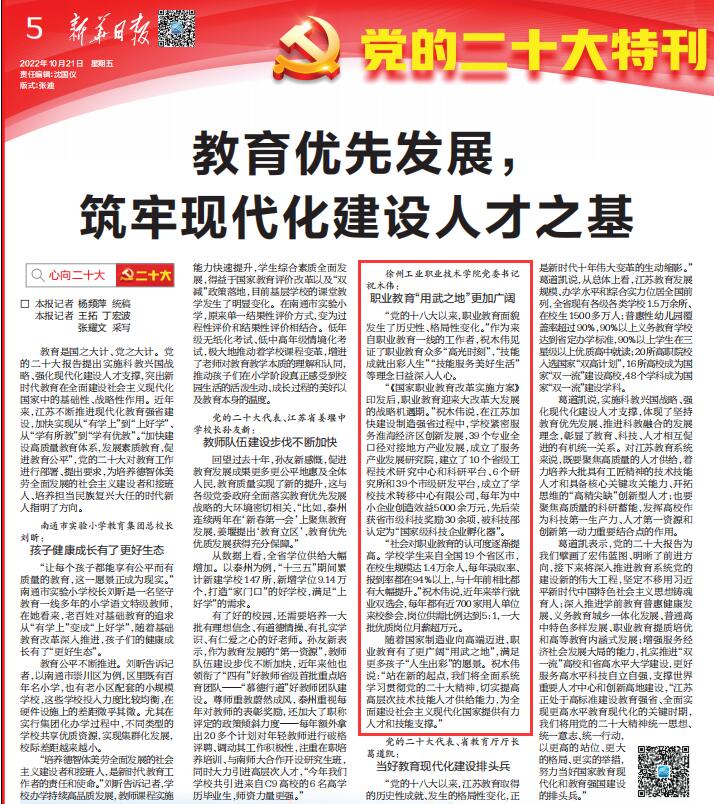 10月21日,《新华日报》党的二十大特刊第5版刊发了《教育优先发展,筑牢现代化建设人才之基》,捕鱼达人破解版 党委书记祝木伟接受了采访。