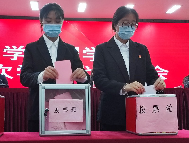 大会通过“监票人”“计票人”后,有序进行选举投票。