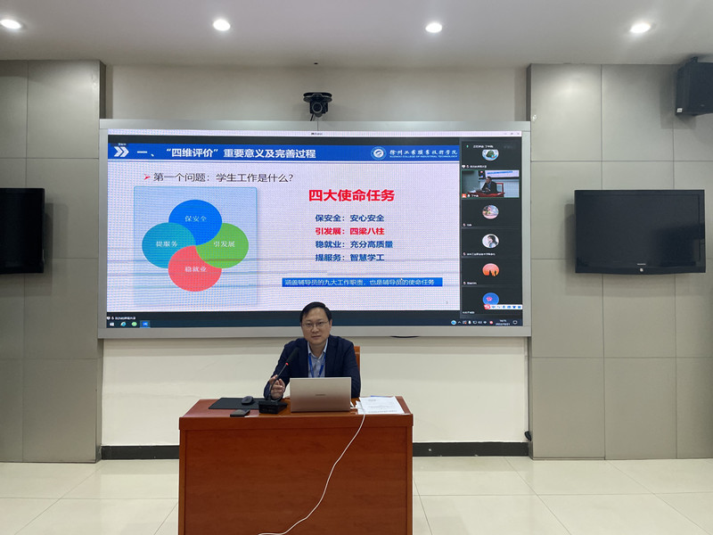 为充分发挥学生“四维评价”系统在引领学生发展中的核心作用,促进学生德智体美劳全面发展,学工处于10月21日下午举办2022年第7期辅导员沙龙暨学生“四维评价”系统宣讲会。本次宣讲会在图书馆视频会议室以线上线下同步的方式进行,由学生工作部部长阮浩主讲,各二级学院副书记、专职辅导员共56人参加了本次宣讲会。