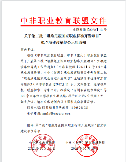 “坦桑尼亚国家职业标准开发项目”针对坦桑尼亚国家重点行业职业技能岗位,优选中国同等职业标准,经本土化修订后,按照坦桑尼亚国家相关流程注册认证,与配套专业教学标准一并纳入坦桑尼亚国家职业教育体系,指导坦桑尼亚国家职业院校开展人才培养工作。据悉,本次项目吸引了来自全国各地超过120余所高等职业院校参与申报。
