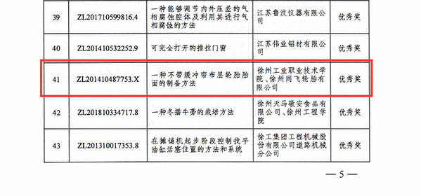 近日,徐州市人民政府下发了《市政府关于表扬第二届徐州市优秀专利项目奖获奖单位的通知》,公布了第二届徐州市专利项目奖获奖名单,捕鱼达人破解版 徐云慧、姚佳莹、宋帅帅、王艳秋、翁国文、朱信明、王瑶、张晴等师生共研授权的发明专利《一种不带缓冲帘布层轮胎胎面的制备方法》荣获第二届徐州市专利项目奖优秀奖。