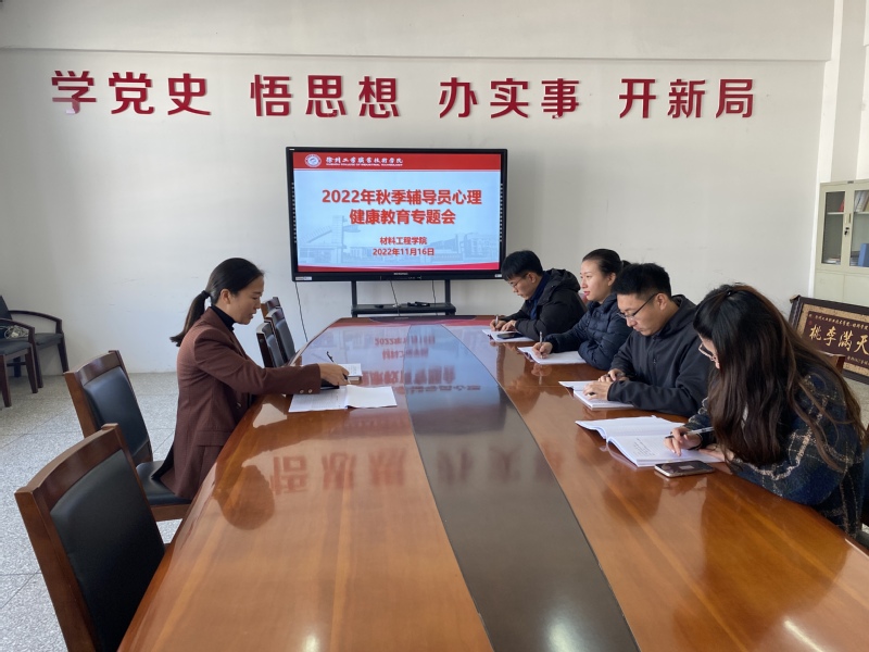 为进一步加强学院学生心理健康教育工作,更好的为学院学生心理健康服务,11月16日下午,材料工程学院在B05-306召开2022年秋季辅导员心理健康教育工作专题会。学院全体辅导员老师参加了会议,会议由学院党总支副书记周树会主持。
