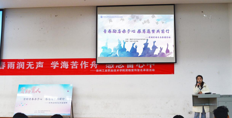活动伊始,“苏乡永助”资助宣传大使、化学工程学院葛佳丽同学详细地向同学们介绍了江苏省本专科教育阶段的资助政策体系,结合家庭经济困难学生认定程序重点讲解了申请标准、评审及发放相关程序。随后,冯欣彤老师希望参加活动的同学可以将资助政策宣传出去,帮助更多有着求学梦想的孩子,成为资助政策的宣传者、励志典型的示范者、知恩感恩的践行者。最后,同学们纷纷在“资助学业梦,春雨润无声,学海苦作舟,感恩留心中”的横幅上签字,一笔一划饱含了对国家资助政策的感恩之情,承诺将以自己的实际行动向社会证明自己会做一个懂得回报、坚守诚信的人。