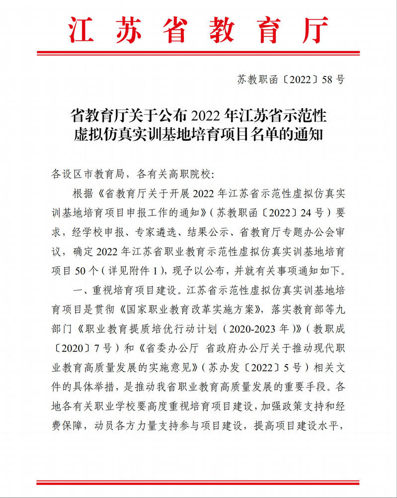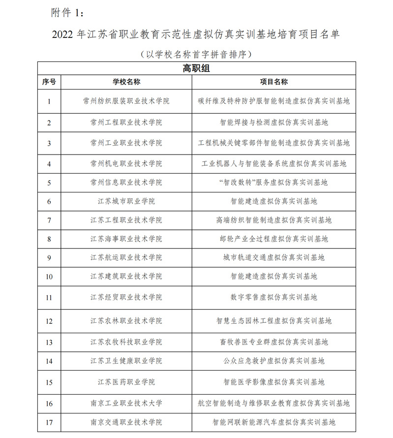 江苏省示范性虚拟仿真实训基地培育项目是贯彻《国家职业教育改革实施方案》,落实教育部等九部门《职业教育提质培优行动计划(2020-2023年)》(教职成〔2020〕7号)和《省委办公厅省政府办公厅关于推动现代职业教育高质量发展的实施意见》(苏办发〔2022〕5 号)相关文件的具体举措,是推动我省职业教育高质量发展的重要手段,项目集教学、实训、培训、科研、竞赛、科普等功能于一体,着力解决职业教育实训中看不到、进不去、成本高、危险性大等特殊困难问题,有效支撑学生综合实践能力培养。