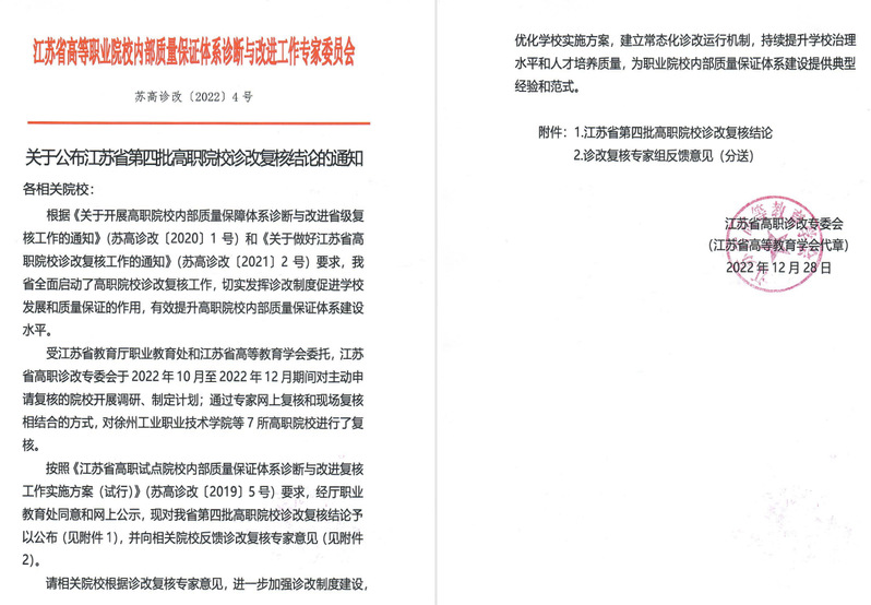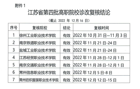近日,江苏省高职诊改专委会发布我省第四批高职院校诊改复核结论,我院等7所高职院校诊改复核结论为有效。