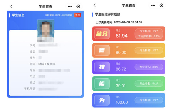 3.成绩查询:登陆成功后,可查看学生信息,分学年查看“四维评价”总分和专业排名,“德、技、能、为”分项分值和专业排名,还可查看学生在班级、学院、年级的排名率情况。此外,还可看到捕鱼达人破解版 教师对学生的评价和学生的自我评价、学生的四维测评报告,详情如下图: