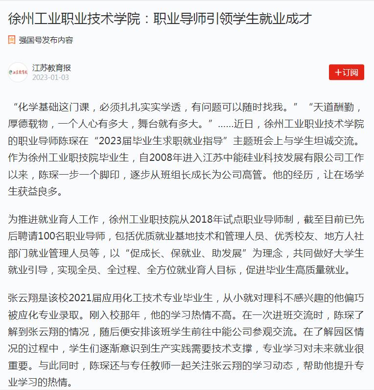 张云翔是该校2021届应用化工技术专业毕业生,从小就对理科不感兴趣的他偏巧被应化专业录取。刚入校那年,他的学习热情不高。在一次进班交流时,陈琛了解到张云翔的情况,随后便安排该班学生前往中能公司参观交流。在了解园区情况的过程中,学生们逐渐意识到生产实践需要技术支撑,专业学习对未来就业很重要。与此同时,陈琛还与专任教师一起关注张云翔的学习动态,帮助他提升专业学习的热情。