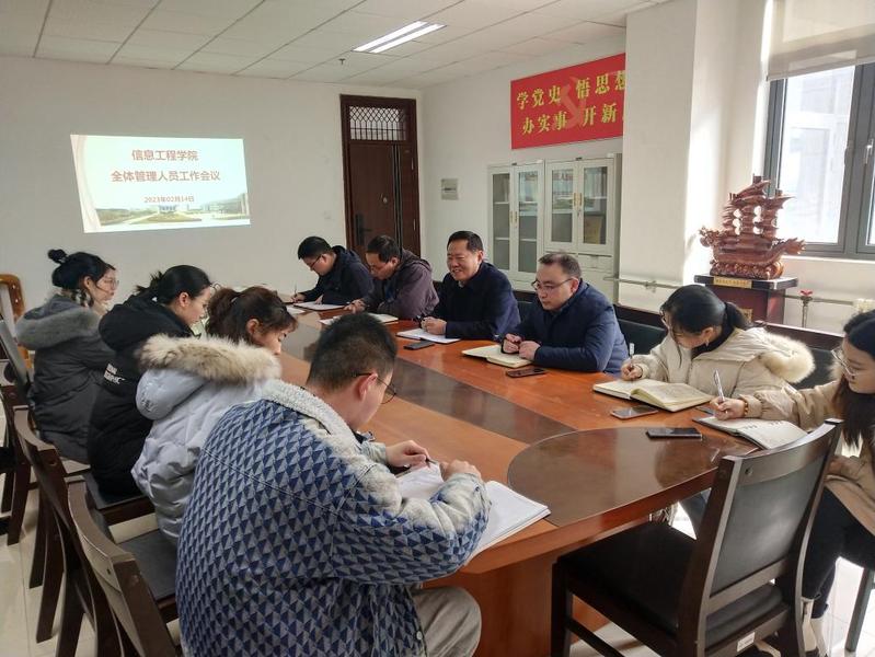 2月14日下午,信息工程学院在B18-1019会议室召开了全体管理人员会议,学院领导、管理人员参加了会议。会议部署了开学初党建、教学、科研、学生管理等各方面工作,要求全体管理人员做好开学初各项工作,严格遵守换届纪律,加强工作作风建设,做到遇事有态度、见识有广度、心中有制度、肩膀有硬度。