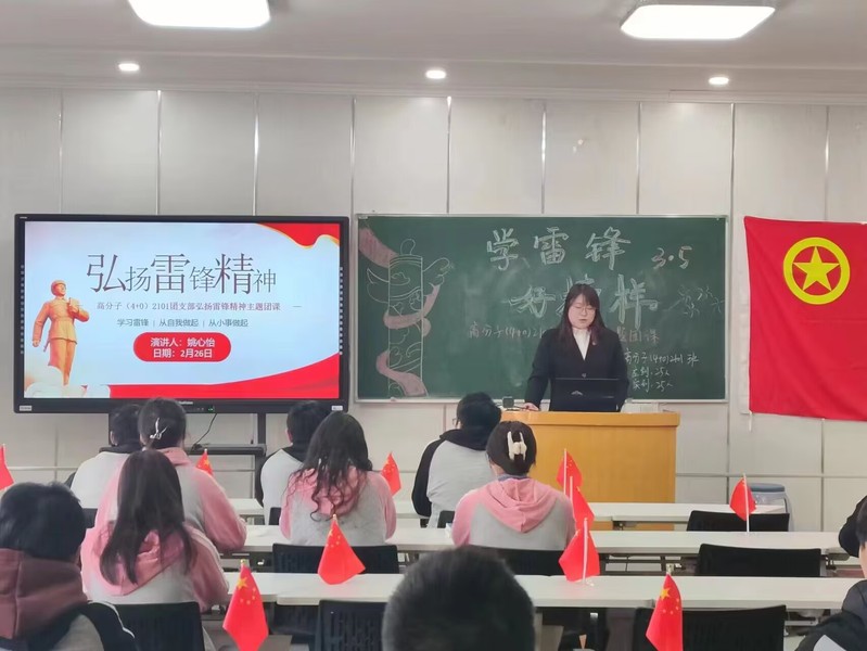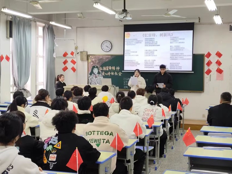 团课过程中,团支书引领青年学子以观看视频、配乐诵读、交流感悟、集体宣誓等方式,加强对新时代雷锋精神的青年化阐释,学习新时代雷锋精神,领悟雷锋精神的丰富内涵。此外,各团支部邀请“中国大学生自强之星”、“最美职校生”、省级“三好学生”、省级社会实践先进个人等社会实践和志愿服务中的先进典型代表通过亲身讲述、分享交流、朋辈对话等形式,生动展示当代青年“小我”融入“大我”的青春风采,发挥“身边榜样”的示范带动作用,团员青年围绕如何“践行新时代雷锋精神”展开热烈讨论,纷纷表示从身边的小事做起,积极参与志愿服务活动,传承雷锋精神。团建指导员全程观摩并在团课结束后进行点评指导。