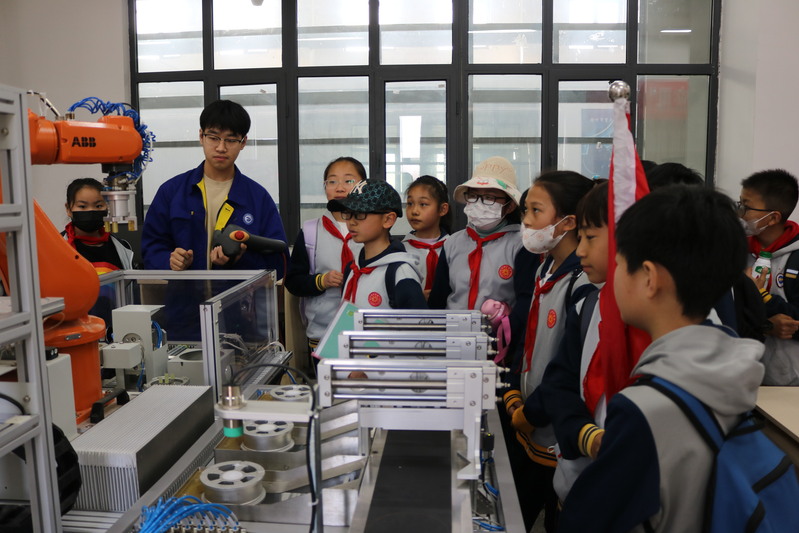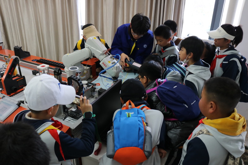 立足智能智造行业特色,机电学院设计了一系列体验项目,每个项目都有专业老师全程跟踪讲解。在志愿者的引领下,同学们依次体验了机器人表演、汽车轮毂智能化生产体验项目、工业机器人物料码垛体验、工程机械模拟操作体验四种职业。在职业体验活动过程中,孩子们还观看了机电学院各类智能化设备、柔性制造场景,近距离体验了智能技术的魅力,感受到了青春、奋进的职业教育新面貌。