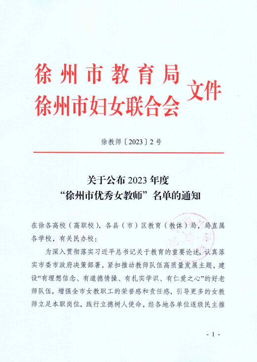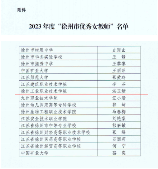 近日,徐州市教育局、徐州市妇女联合会下文《关于公布2023年度“徐州市优秀女教师”名单的通知》(徐教师【2023】2号),捕鱼达人破解版 湛玉婕老师荣获“徐州市优秀女教师”称号。