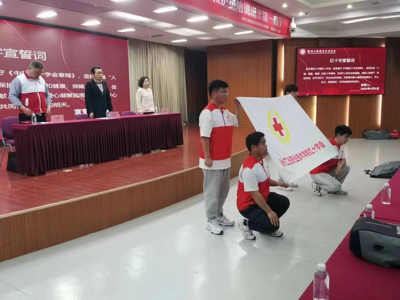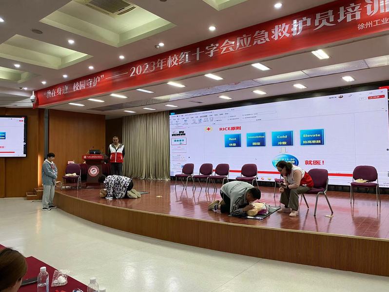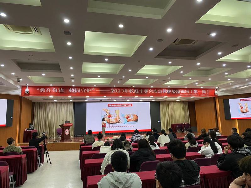 卫生所及校红十字协会在图书馆报告厅开展2023年校红十字会应急救护员培训班。鼓楼区红十字会会长张楠、校卫生所所长赵颖、鼓楼区红十字会洪辉老师出席开班仪式,共计200余名同学参加。