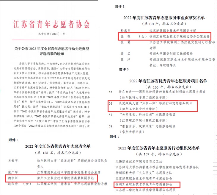 其中,汽车工程学院辅导员、校团委兼职副书记魏宇川获“江苏省优秀青年志愿者”,校团委办公室主任盖薇获“江苏省青年志愿服务事业贡献奖”。机电工程学院的关爱残疾儿童“六位一体”彩虹行动志愿服务项目获“江苏省优秀青年志愿服务项目”,校青年志愿者协会获“江苏省青年志愿服务行动组织奖”。
