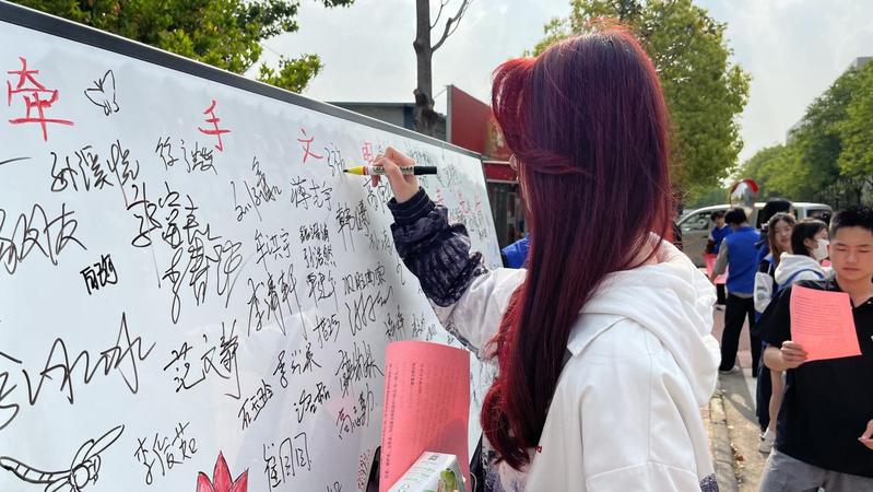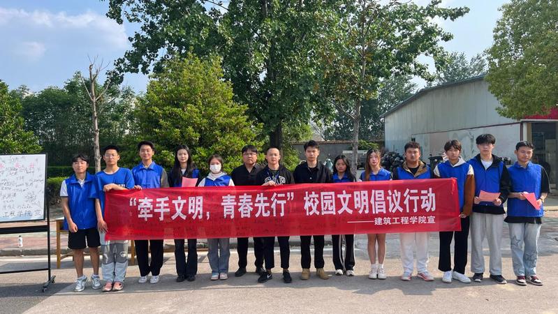 志愿劳动,倡导校园文明。建筑工程学院把劳动教育实践与学生文明素养养成教育有机结合起来,引导在校学生爱护校园环境,珍惜劳动成果。在此次劳动实践教育开展期间,每天中午组织志愿者到包干区内人流量大的地方进行文明素养督查行动,对不文明现象进行劝阻。在宿舍楼下开展“牵手文明、青春先行”校园文明倡议行动,向同学们发放校园文明倡议书,引导同学们在条幅和签字板上郑重地签上自己的姓名,争做维护校园文明的先行者。