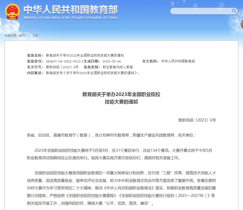 全国职业院校技能大赛是教育部牵头发起、联合34家部委和事业组织举办的一项公益性、国际性职业院校师生综合技能竞赛活动,是我国职业教育一项重大制度设计和创新。自2008年以来已成功举办15届,规模不断扩大,水平逐年提升,国内外影响力逐步增强,在引领职业教育“三教”改革、提高技术技能人才培养质量、促进高质量就业、服务经济社会发展、助力中外职业教育交流合作等方面发挥了重要作用,已经成为广大职教师生展示风采、追梦圆梦的重要舞台和中国职业教育的靓丽品牌。