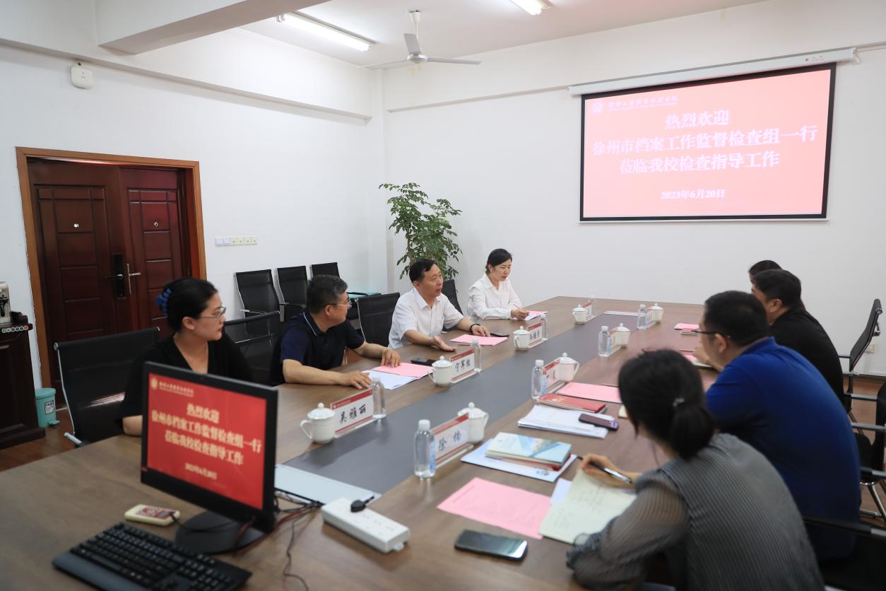 6月20日下午,徐州市档案馆副馆长沈勇、市委办公室档案管理处处长丁晨、市档案馆管理利用处处长王晓露、市档案馆管理利用处处长徐楠一行四人来我校开展档案监督检查工作。党委委员、副院长孙健身主持召开了档案检查工作汇报会,图文中心(综合档案室)主任宁军胜及综合档案室工作人员参加了会议。