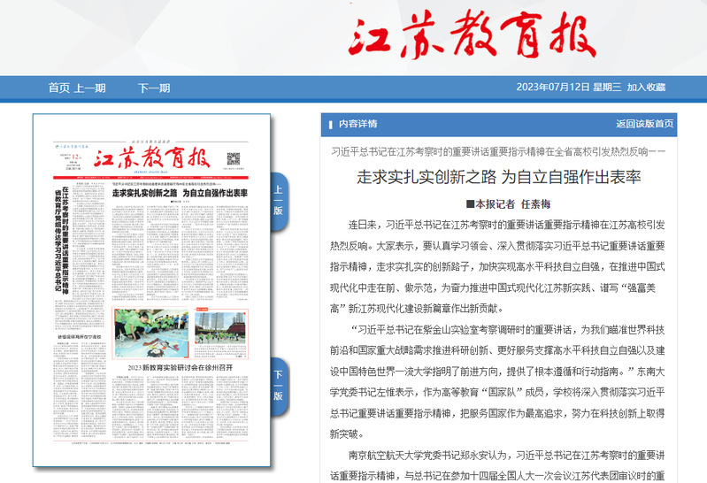 连日来,习近平总书记在江苏考察时的重要讲话重要指示精神在江苏高校引发热烈反响。大家表示,要认真学习领会、深入贯彻落实习近平总书记重要讲话重要指示精神,走求实扎实的创新路子,加快实现高水平科技自立自强,在推进中国式现代化中走在前、做示范,为奋力推进中国式现代化江苏新实践、谱写“强富美高”新江苏现代化建设新篇章作出新贡献。