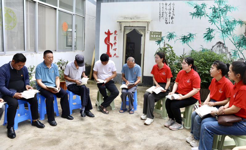 调研中,汉王镇文化站站长段洁茹向师生们展示了紫山村儿童的手绘、陶艺作品,一幅幅生动的画面描绘出朝气蓬勃的乡村生活,一个个奇思的器型展现出创意满满的乡村智慧。随后,调研团队走访了党员中心户张和胜大爷,在访谈中得知张大爷主动响应镇里号召,利用家中空闲的屋子打造村民“读书角”,在耕作之余带领党员群众,积极学习党的二十大精神,听党话、跟党走。团队成员表示:“读书角是村民身边的思政课堂、精神家园,是乡村振兴的生动写照。小课堂、大智慧,读书角汇集民情、民智、民意,将党的好政策、好故事送到千家万户。”