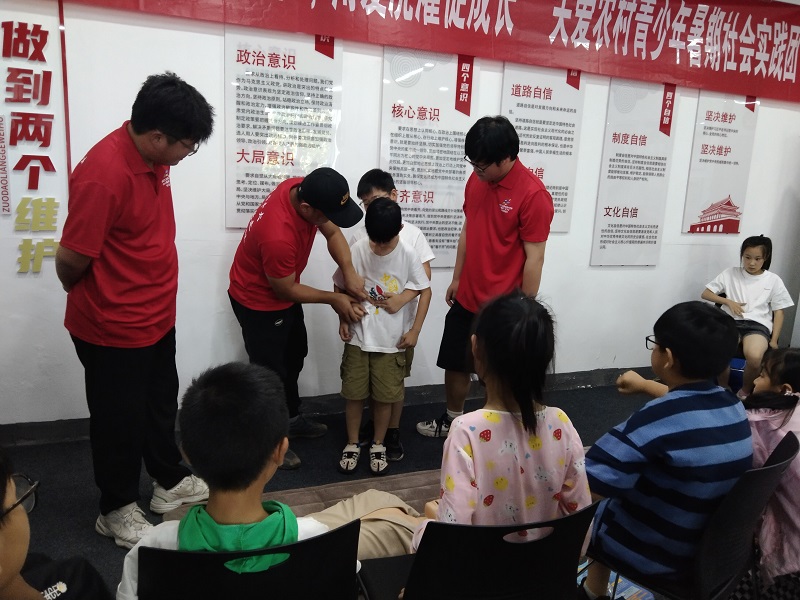 在“技能学堂”中,实践团成员袁隆翔等四位同学开展了人工呼吸心肺复苏演示、海姆立克方法和简易包扎展示,现场气氛活跃,小朋友们积极参与体验,他们纷纷表示:在今后的学习生活中,要增强防溺水安全意识,不涉水域,不去野泳,珍爱生命,远离危险。