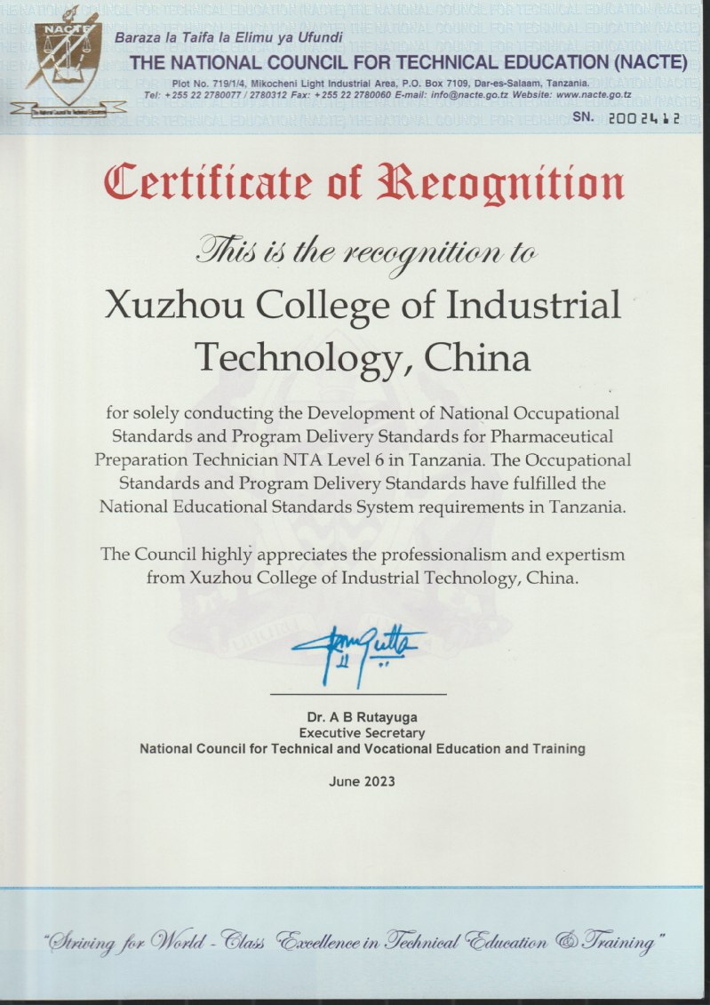 坦桑尼亚国家职业标准项目经申报、专家评审和在线答辩等环节,于2022年10月正式立项启动,化工学院吴昊副教授带领的教师团队与坦桑尼亚教育部国家职业教育委员会组织的专家团队进行多次线上工作研讨,结合坦桑尼亚实际现状与需求,深入省内外相关企业调研实际生产状况,通过深入的调研、比对,创新专业人才培养模式,开发了药物制剂技术员NTA-6级的国家职业标准及配套的专业教学标准,最终顺利通过坦桑尼亚教育部国家职业教育委员会注册认证并获得官方认证证书,正式纳入坦桑尼亚国家职业教育体系。