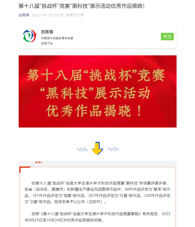 “挑战杯”大学生课外学术科技作品竞赛“黑科技”展示活动主要围绕科技“卡脖子”难题,探寻科技前沿领域中具有前瞻性、创新性、应用性的实物和技术,旨在引导鼓励青年学子针对前沿领域开展具有颠覆性、超越性、创新性的研究,凸显创新前沿与实践应用的结合,重点考察作品的创造性、科学性和应用性,是“挑战杯”系列赛事的重要组成部分。在全国高校推报的作品中,99件作品评定为“星系”级作品、181件作品评定为“恒星”级作品、267件作品评定为“行星”级作品、330件作品评定为“卫星”级作品。