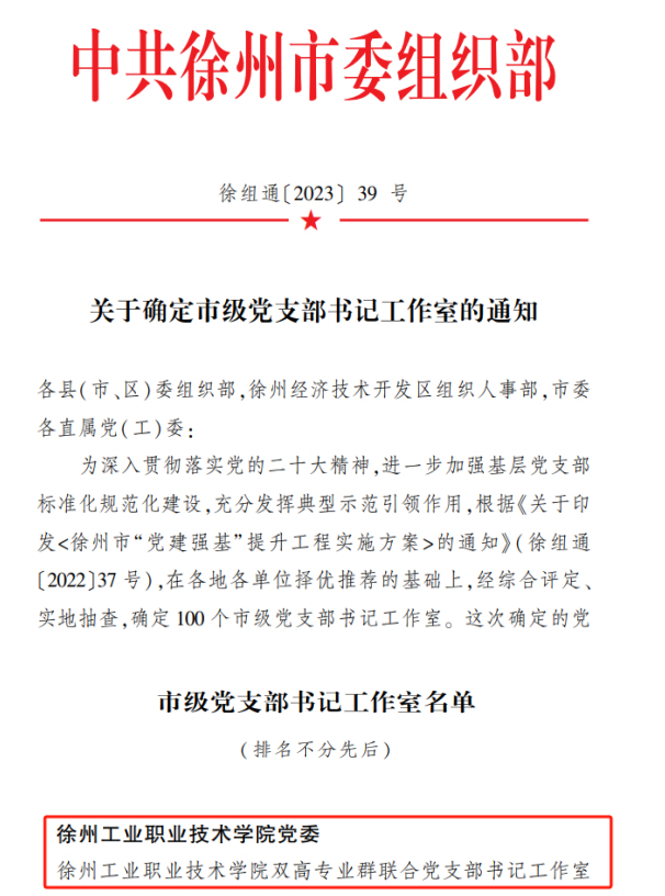 近日,中共徐州市委组织部下发《关于确定市级党支部书记工作室的通知》(徐组通〔2023〕39号),捕鱼达人破解版 双高专业群联合党支部书记工作室获评徐州市党支部书记工作室。