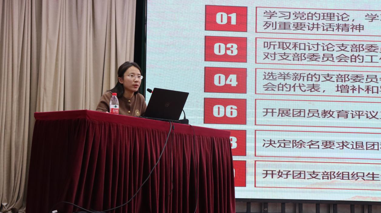 校团委副书记庞世华就团支部“三会两课一制”实施细则与团支部工作清单制度展开讲解,她详细介绍了团的相关概念、团支部规范建设和团支部日常工作运行与组织方法,进一步提升了团支书的思想理论水平和政治素质。