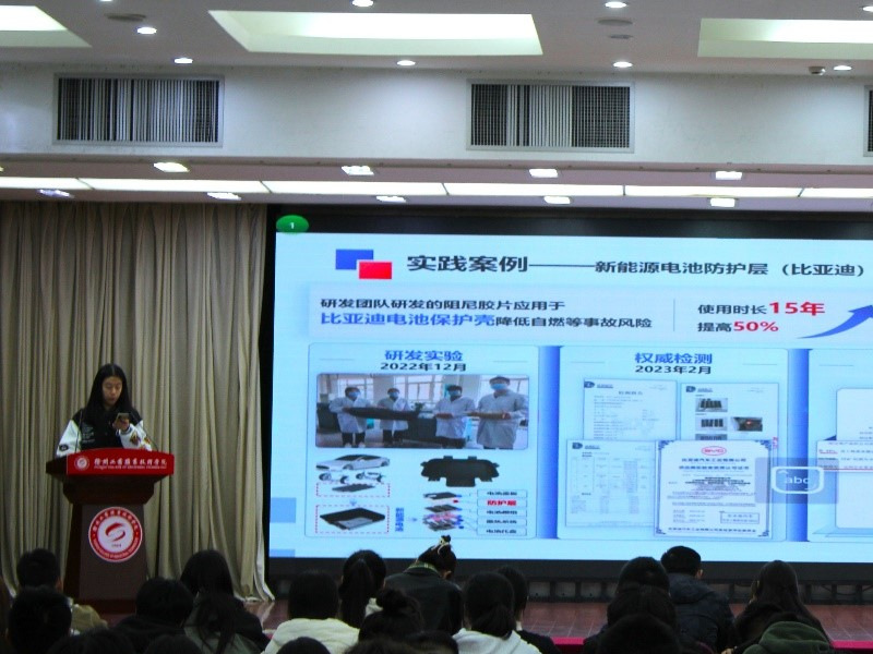 材料工程学院杨梦同学展示了她团队的项目——“车用减震隔音高分子材料领跑者”,该项目曾获2023年江苏省职业院校创新创业大赛获得省二等奖、“挑战杯”全国大学生系列科技学术竞赛二等奖等荣誉。该团队所开发的汽车悬架减震系统关系到车辆行驶的稳定性,乘坐舒适性和安全性,其性能在业界处于领先地位。