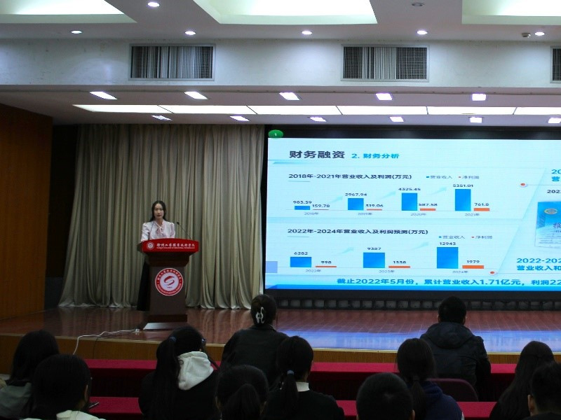 工商管理学院李昱姝同学展示了她的团队项目“‘职’为有你——专注蓝领高质量就业的先行者”,该同学紧密围绕创业项目特点讲述了创业活动的背景、意义、实施过程、取得成果等,并向师生分享了参加创新创业活动以及在赛场逐梦的体会和感悟。