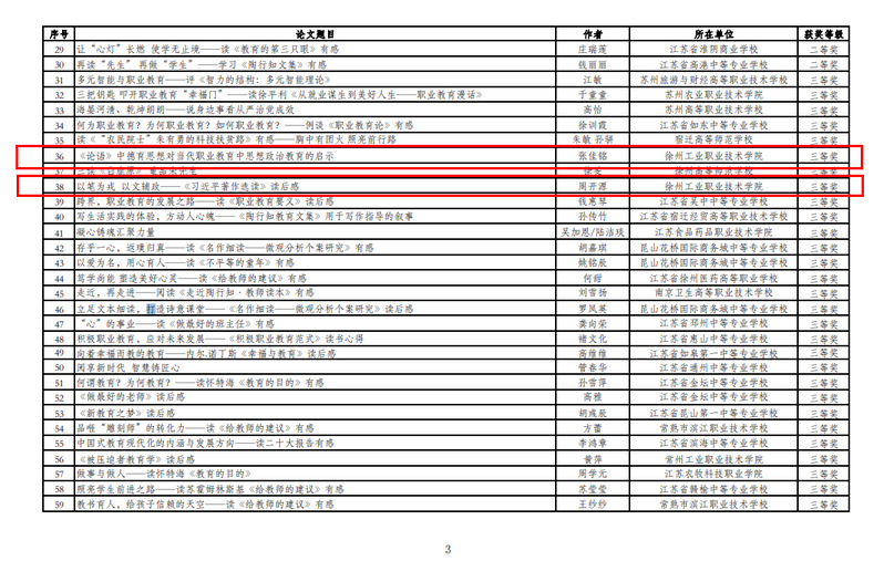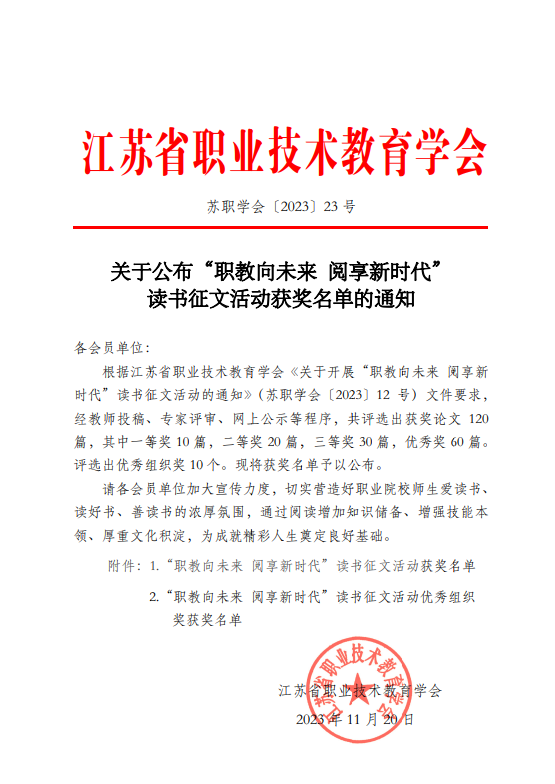 近日,江苏省职业技术教育学会公布了2023年“职教向未来 阅享新时代”读书征文活动获奖名单,捕鱼达人破解版 获得三等奖两项、优秀奖三项,同时获得优秀组织奖。其中,捕鱼达人破解版 张佳铭老师撰写的书评《<论语>中德育思想对当代职业教育中思想政治教育的启示》、周开源老师撰写的书评《以笔为戎以文辅政——<习近平著作选读>读后感》获三等奖,于晴老师撰写的《以“陶”启思,五“心”育人,闻“道”行知——读<陶行知文集>有感》、盖薇老师撰写的《生活即教育——读<陶行知文集>有感》、周波老师撰写的《走好立德树人、匠心育人的职教新长征路——<弘扬伟大长征精神,走好今天的长征路>读后感》获优秀奖。