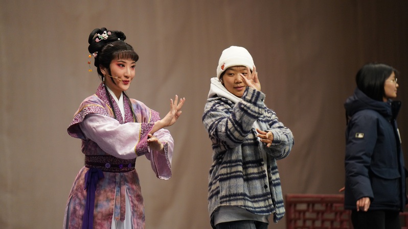 在主持人的剧目导赏后,首先上演了一场精彩的戏曲互动课,几位充满热情的大学生“戏迷”,争相登上舞台,向演员们学习与尝试越剧表演中的身段与唱腔。